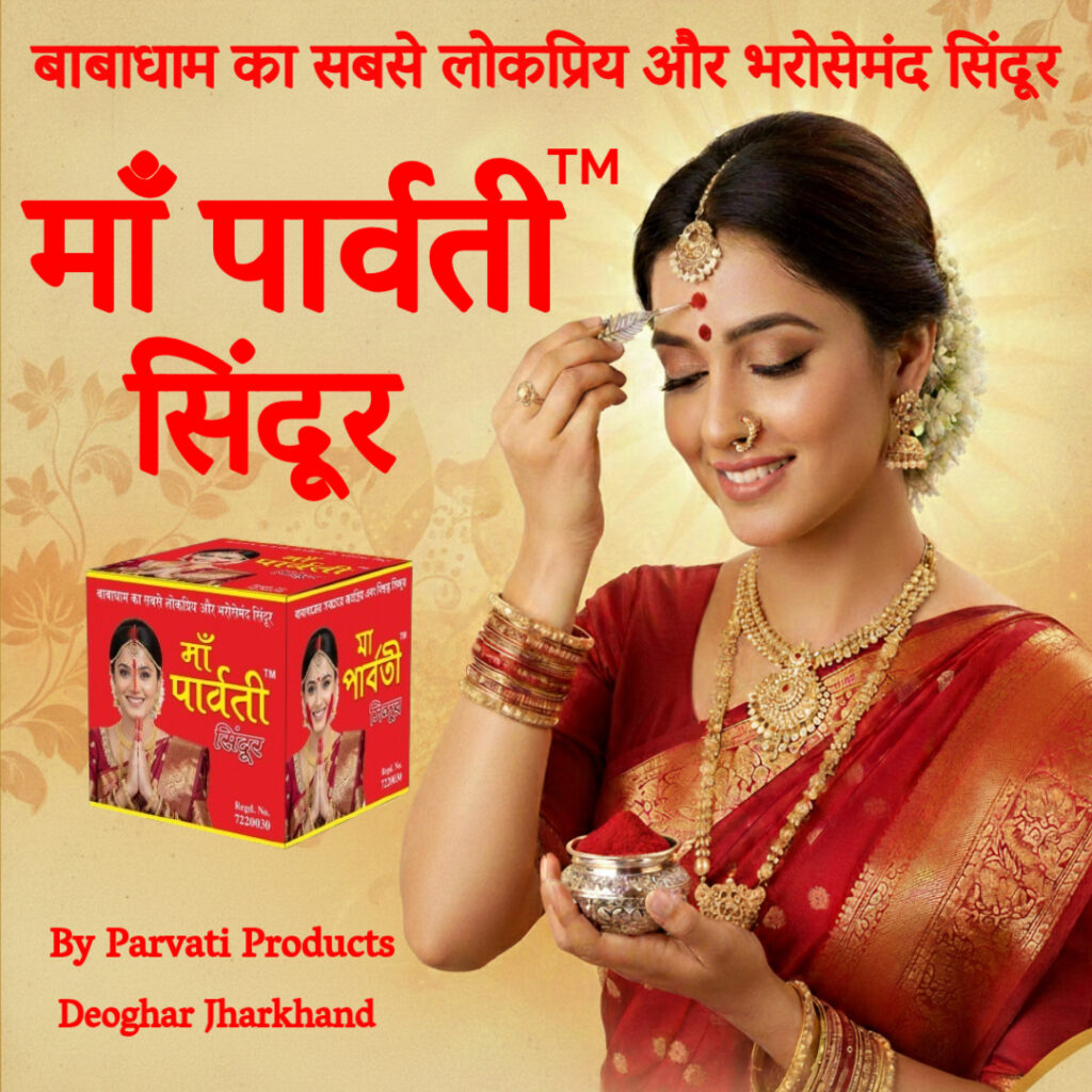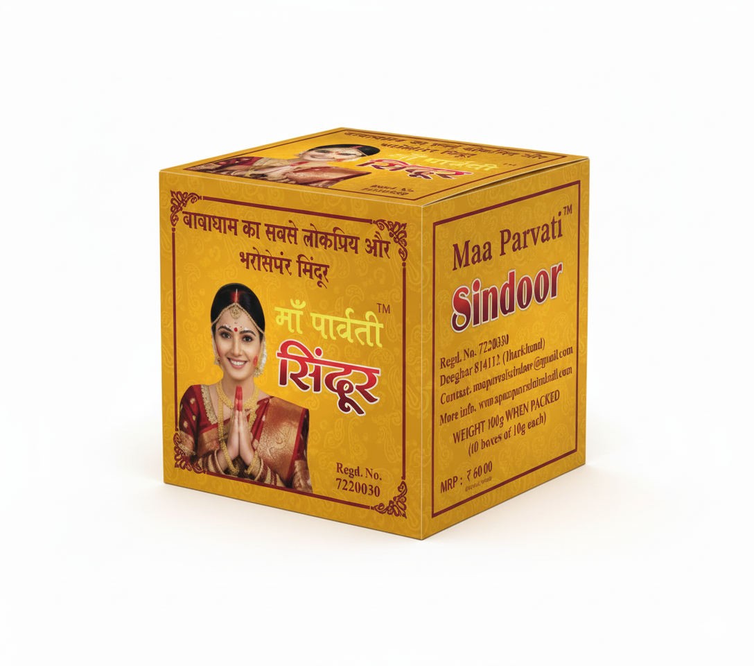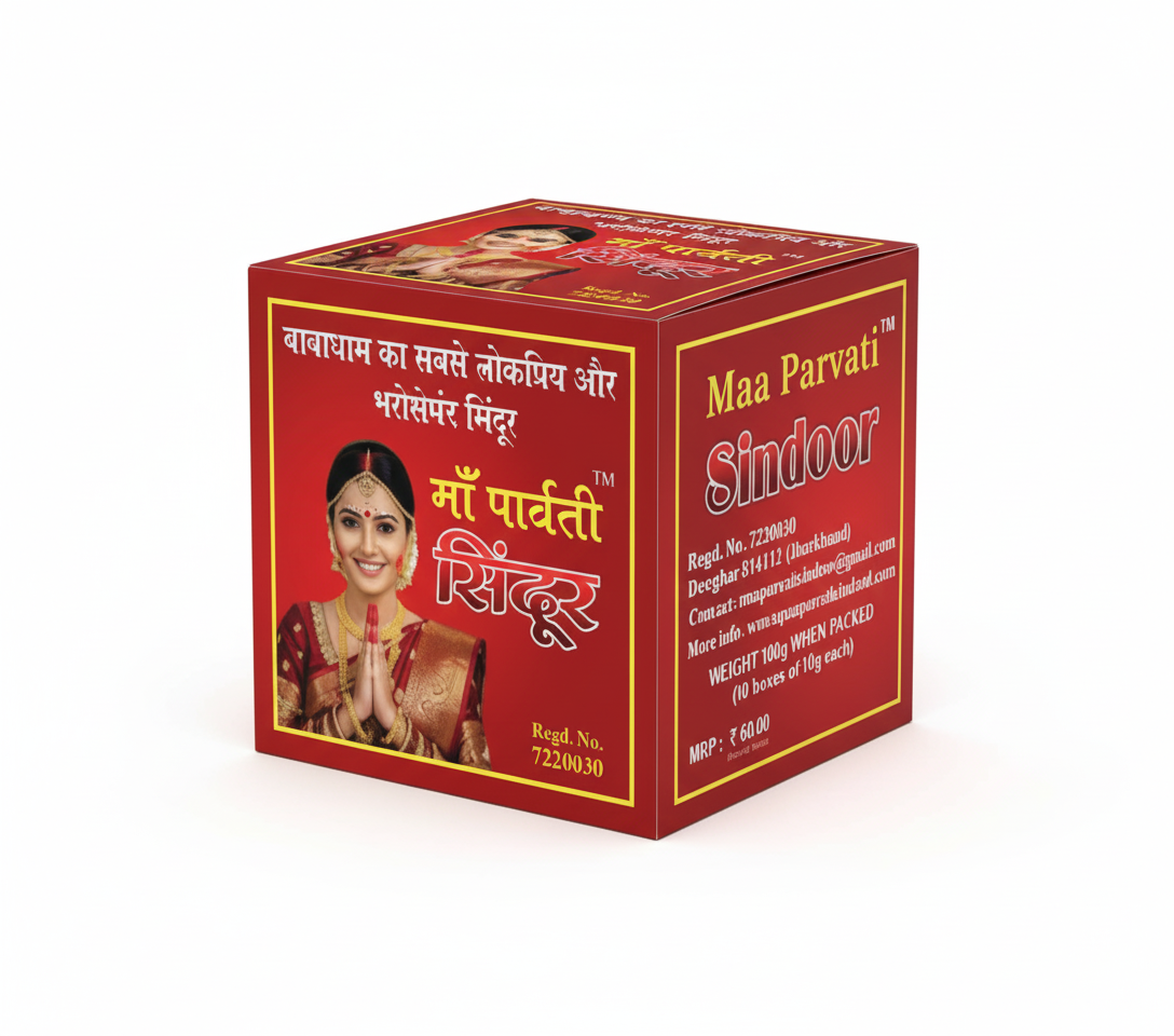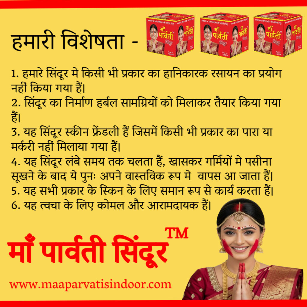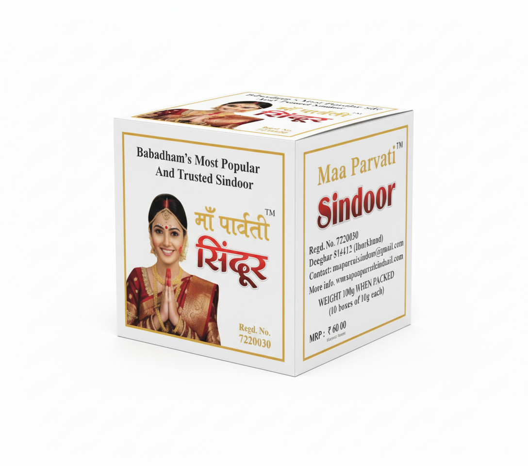 बाबाधाम का सुप्रसिद्ध माँ पार्वती सिंदूर, शुद्धता और गुणवत्ता मे श्रेष्ठ| सिंदूर मे किसी भी प्रकार का हानिकारक रसायन का प्रयोग नहीं किया गया हैं! सिंदूर का निर्माण हर्बल सामग्रियों को मिलाकर तैयार किया गया हैं। यह सिंदूर स्कीन फ्रेंडली हैं जिसमें किसी भी प्रकार का पारा या मर्करी नहीं मिलाया गया हैं। यह सिंदूर लंबे समय तक चलता हैं, खासकर गर्मियों मे पसीना सूखने के बाद ये पुनः अपने वास्तविक रूप मे वापस आ जाता हैं। यह सभी प्रकार के स्किन के लिए समान रूप से कार्य करता हैं। यह त्वचा के लिए कोमल और आरामदायक हैं।
